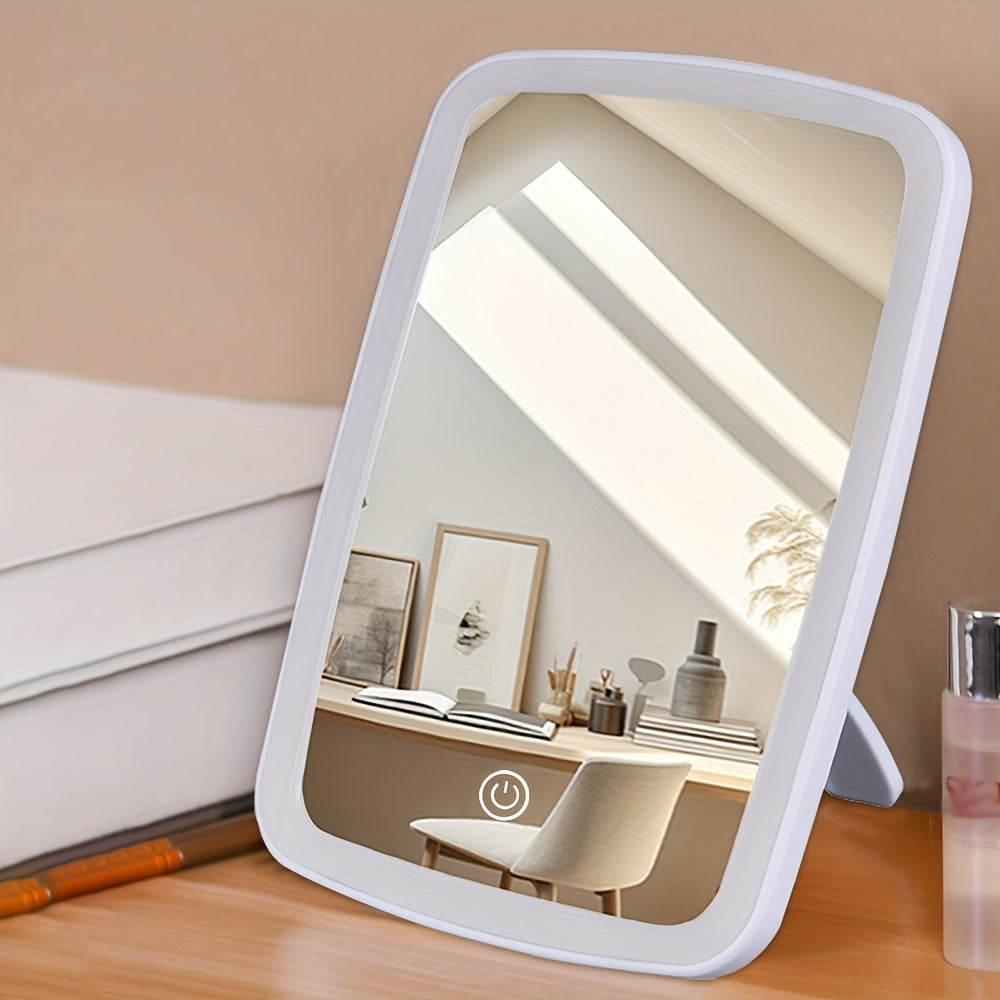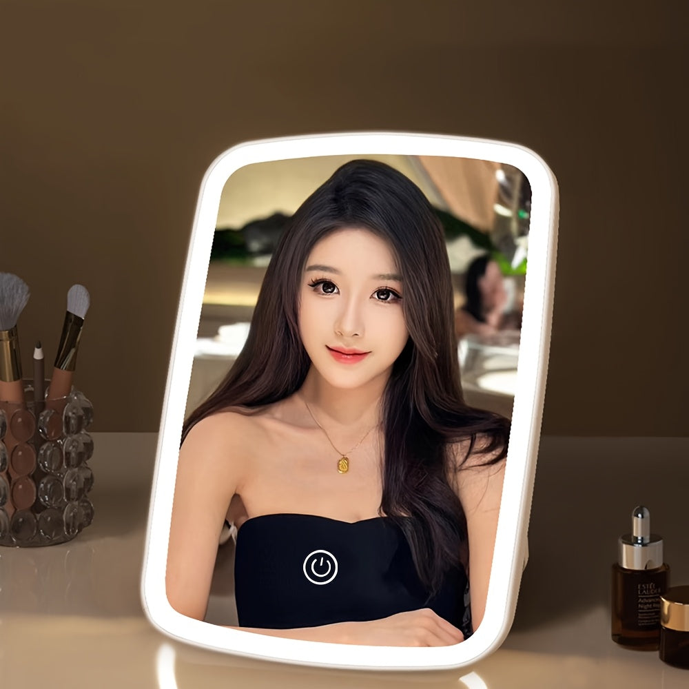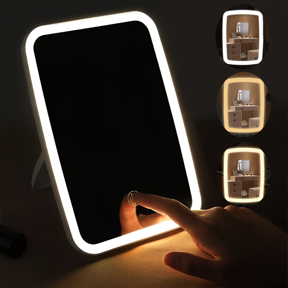 Unfold the mirror and place on vanity table. Use touch switch to select lighting color and adjust brightness. Fold for easy storage and travel. Recharge via USB when needed.